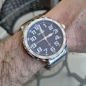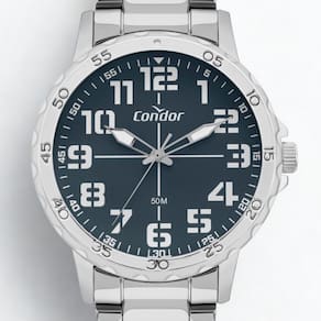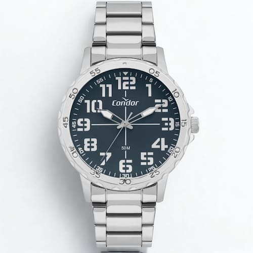 Descubra a força do lançamento de militar. Relógio de aro com marcação de minutos e mostrador com numeração completa, com pulseira em 3 links e banho prateado e mostrador na cor azul.