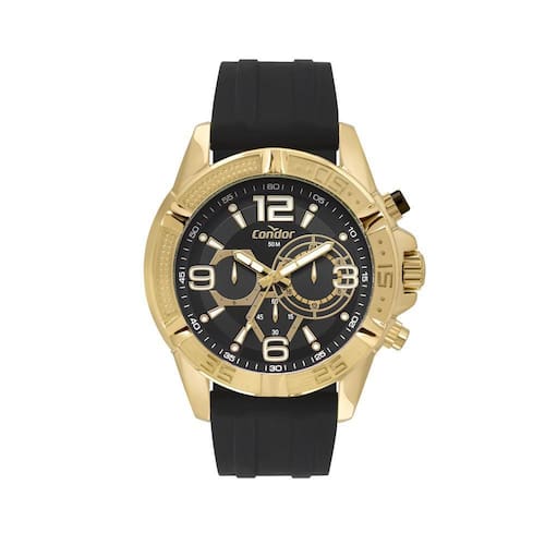 Relogio masculino condor covd34aj/5p Cor: silicone Esse relógio masculino da linha civic está dando o que falar com essa belíssima combinação entre o banho dourado e mostrador preto além disso, ele vem com uma caixa dourada de metal 49mm, pulseira de silicone preta, botões na lateral com a cor do mostrador, resistência de 5atm e maquinismo multifunção.