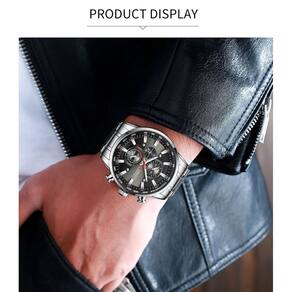 Relógio masculino com design moderno e estrutura resistente. Modelo analógico com movimento de quartzo e cronógrafo funcional. Possui exibição de data, ponteiros luminosos e visor Hardlex com alta resistência a riscos. A pulseira em aço inoxidável proporciona ajuste seguro e durabilidade no uso diário. Resistente à água até 3 ATM, adequado para respingos e chuva leve.