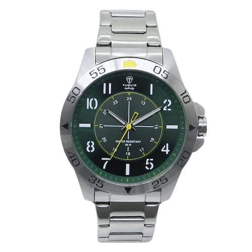 Relógio Masculino de Aço Tuguir Analógico Infinity 9167F Prata e Verde e AmareloMarca: Tuguir Categoria: Analógico Analógico: Sim (1 Horário) Ponteiros Fluorescentes: Não Digital: Não Luz: NãoResistente à Água: 5 ATM (Pode ser utilizado para nadar no raso, por pouco tempo submerso) - Respingos: Sim - Chuva: Sim - Lavar Carro: Sim - Lavar Louça: Sim - Natação: Sim - Mergulho: Não Característica do Vidro: Cristal Mineral Tipo de Fecho: Dobrável com Botão Cor da Caixa: Prata Material da Caixa: Aço Formato da Caixa: Redondo Diâmetro da Caixa: 45,00 (mm) Espessura da Caixa: 10,00 (mm) Cor da Pulseira: Prata Material da Pulseira: Aço Largura da Pulseira: 20,00 (mm) Comprimento Máximo da Pulseira: 280,00 (mm) Alimentação: Bateria Interna Peso Líquido: 0,120 Kg Modelo: Infinity 9167F Cor Predominante: Prata Cor Diferencial: Verde e Amarelo Garantia: 12 MesesConteúdo da Embalagem: 01 Relógio 01 Embalagem 01 Termo de Garantia