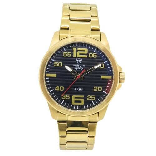 Marca: Tuguir Categoria: Analógico Analógico: Sim (1 Horário) Ponteiros Fluorescentes: Não Digital: Não Luz: Não Resistente à Água: 5 ATM - Respingos: Sim - Chuva: Sim - Lavar Carro: Sim - Lavar Louça: Sim - Natação: Sim - Mergulho: Não Característica do Vidro: Cristal Mineral Tipo de Fecho: Dobrável com Botão Cor da Caixa: Dourado Material da Caixa: Aço Formato da Caixa: Redondo Diâmetro da Caixa: 43,00 (mm) Espessura da Caixa: 9,00 (mm) Cor da Pulseira: Dourado Material da Pulseira: Aço Largura da Pulseira: 20,00 (mm) Comprimento Máximo da Pulseira: 280,00 (mm) Alimentação: Bateria Interna Peso Líquido: 0,110 Kg Modelo: Infinity 9169A Cor Predominante: Dourado Cor Diferencial: Preto Garantia: 12 Meses