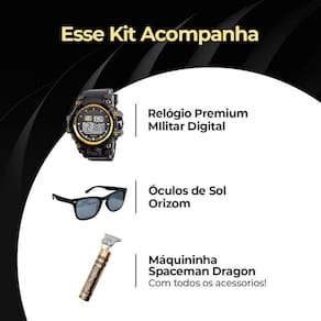 Kit Relógio Digital Masculino e Óculos de Sol Preto Orizom SpacemanEste kit exclusivo é perfeito para os homens que buscam estilo e funcionalidade em seus acessórios. Combinando um relógio digital masculino robusto e um par de óculos de sol elegantes, este conjunto é ideal para complementar seu visual com um toque de sofisticação.Relógio Digital Masculino Preto com Detalhes em Dourado e Pulseira de Silicone AjustávelGaranta um visual sofisticado e moderno com o relógio digital masculino preto com detalhes em dourado da Orizom Spaceman. Com prova d'água e pulseira de silicone ajustável, este relógio possui um diâmetro de aproximadamente 5 cm, proporcionando um visual grande e robusto que certamente chamará a atenção.Óculos de Sol Preto Orizom Spaceman com Proteção UVProteja seus olhos com estilo com o par de óculos de sol preto da Orizom Spaceman. Com proteção UV, este óculos possui uma frontal de aproximadamente 14 cm e hastes de 14,5 cm de comprimento, proporcionando um ajuste confortável e elegante para qualquer ocasião.Bônus Especial na Compra deste Kit:Ao adquirir este kit exclusivo, você também receberá como bônus especial a Máquina de Cortar Cabelo Orizom Spaceman Dragon. Com todos os acessórios conforme a segunda imagem, esta máquina oferece cortes precisos e acabamentos impecáveis, com um design ergonômico para garantir conforto durante o uso.Aproveite esta oferta exclusiva e eleve seu estilo com praticidade no dia a dia. Adquira agora mesmo o kit completo Orizom Spaceman!