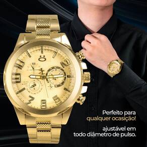 Adquira já este relógio masculino com o estilo refinado da linha Orizom Spaceman! Com um banho dourado elegante e uma construção robusta em aço inoxidável, este relógio analógico é uma escolha de alta qualidade para homens que apreciam sofisticação e durabilidade em seus acessórios.