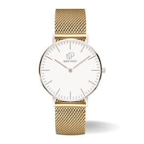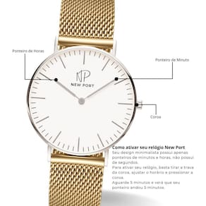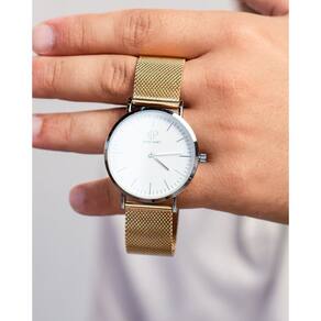 O Relógio Masculino de Pulso Bonaparte Casual, com sua pulseira em metal dourada, apresenta um generoso diâmetro de 40mm. A caixa é construída em metal prateado, abrigando um mostrador branco protegido por um vidro de mineral com alta resistência.