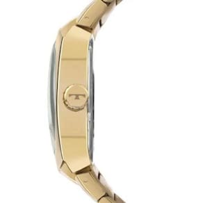 Este relógio possui um banho dourado de alta qualidade, que garante durabilidade e resistência ao desgaste. Sua caixa é redonda e possui um mostrador preto, que contrasta perfeitamente com os detalhes dourados, proporcionando uma leitura clara e fácil das horas.