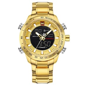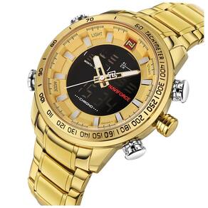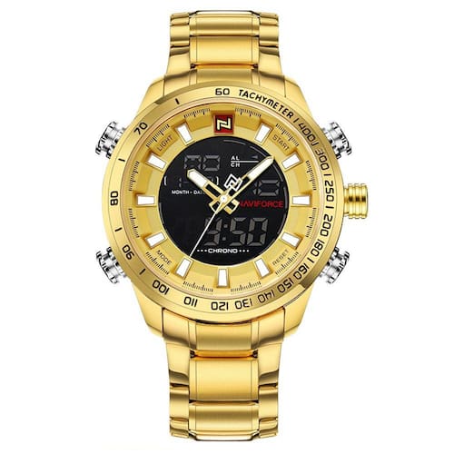 Relógio Masculino Dourado Digital Esportivo NAVIFORCE 9093 Descrição: Marca: NaviforceTipo de Item: Relógio de pulso de quartzoCaracterística: Luz Negra, Alarme, À Prova D'Água, Múltiplos Fusos Horários, Resistente a Choques, Calendário Completo, Natação, Data Automática, Display de LEDProfundidade de Resistência a Água: 3BarComprimento da Pulseira: 22,5cmMaterial das Caixas e Estojos: PapelEstilo: Esportivo, MilitarFecho: Fecho de Botão de Pressão OcultoGênero: MasculinoEspessura da caixa: 16mmMovimento: DuploFormato do Estojo: RedondoModelo Número: NAVIFORCE 9093Diâmetro da Caixa: 48mmMaterial do Invólucro: LigaMaterial da Faixa: Aço InoxidávelLargura de banda: 24mmJanela Dial: Hardlex