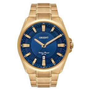 Características Composição do Vidro: Cristal Mineral Material da Caixa: Aço Inox Cor da Caixa: Dourada Material da Pulseira: Aço Inox Cor da Pulseira: Dourada Mostrador: Fundo azul com Calendário