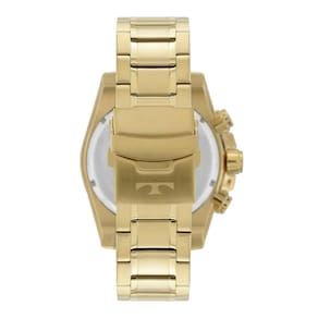 Com uma caixa dourada e pulseira de aço, este relógio possui um banho dourado que confere um acabamento impecável e duradouro. Além disso, seu formato redondo e mostrador também dourado garantem um visual harmonioso e elegante.