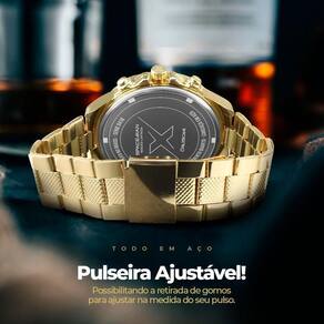 Relogio Masculino Dourado + Oculos Proteção Uv Casual Social Kit de Presente Orizom Spaceman X - Relógio Masculino, Corrente, Pingente e Óculos Pensando em presentear a pessoa amada no Dia dos Namorados? Então este é o kit perfeito para você! O Kit de Presente Orizom Spaceman X inclui um Relógio Masculino Orizom Spaceman X, uma corrente grumet dourada, um pingente em formato de cruz e um par de óculos masculinos Orizom Spaceman.