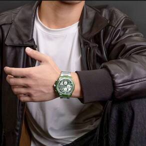 [Fecho de aço] inoxidável que não só mantém a durabilidade, mas também oferece um ajuste moderno e confortável, garantindo segurança com um charme esportivo. [Movimento de quartzo] de alta precisão que não deixa você na mão, sempre pontual, combinando tecnologia e estilo clássico. [Cronógrafo com Data] que mantém você a par do tempo e permite agendar compromissos de maneira eficiente, sem abrir mão da sofisticação. [Á prova d'água] até 30m, ideal para quem vive intensamente cada momento, sem se preocupar com respingos. [Mãos luminosas], projetadas para brilhar no escuro, facilitando a visibilidade e adicionando um toque de modernidade à sua rotina