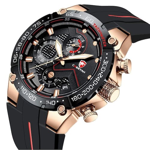 Características: Marca: Cheetah Modelo: 1606 Categoria: Analógico Estilo: Esportivo Movimento: Quartzo Cronógrafo: Ponteiros funcionais Calendário: Sim Diâmetro da caixa visor : 45 mm Espessura da caixa visor : 14 mm Tamanho da pulseira: 225 mm Largura da pulseira: 17.5 mm Tipo de fecho: Fivela Simples Material do Visor: Vidro Mineral Material da caixa: Liga Material da pulseira: Silicone Peso liquido: Cerca de 106g Alimentação: Bateria Resistente à Água: 5ATM : 03 Meses Conteúdo da Embalagem: - Relógio - Manual de instruções em inglês - Certificado internacional de originalidade Marca: Não Informado