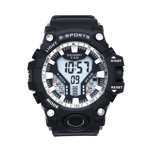 Relógio S828-07-1 Relógio Masculino Esportivo Digital Preto e Branco\nO Relógio Masculino Esportivo Digital possui um design moderno e robusto nas cores preto e branco, ideal para quem busca estilo, resistência e funcionalidade no dia a dia.\nSeu display digital grande permite visualizar as horas com facilidade, enquanto o design esportivo combina perfeitamente com atividades físicas, trabalho e uso casual.\nO relógio também conta com resistência à água de até 50 metros (WR50M), oferecendo mais segurança para uso diário e esportes.