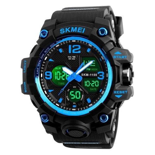 Relógio Masculino Esportivo Digital Skmei 1155 Prova D'água Cor: Azul Relógio Masculino Esportivo Digital Analógico Militar Exercito Skmei 1155B AnaDigi Grande LED Características: Marca: Skmei Modelo: 1155B Categoria: AnaDigi Analógico: Sim Ponteiros Fluorescentes: Sim Digital: Sim Formato da hora: 12/24 Despertador: Sim Bip de hora em hora: Sim Calendário: Sim Mostra o Dia da Semana: Sim Mostra o Dia do Mês: Sim Cronômetro: Sim Cronômetro Regressivo timer : Não Luz: Sim Cor da Iluminação: Verde Resistente à Água: 5BAR/5ATM/50M Pode ser Utilizado para nadar no raso, por pouco tempo submerso - Respingos: Sim - Chuva: Sim - Lavar Louça: Sim - Natação: Sim - Mergulho: Não Característica do Vidro: Resina Tipo de Fecho: Fivela Dupla Material da Caixa: Plástico Material da Pulseira: Borracha Formato da Caixa: Redondo Diâmetro da Caixa: 55 mm Espessura da Caixa: 17 mm Largura da Pulseira: 22 mm Comprimento da pulseira: 235 mm Ajustável Alimentação: Bateria Peso Líquido: 72g : 03 Meses Conteúdo da Embalagem: - Relógio - Estojo do relógio -