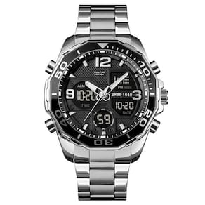 Relógio Masculino Esportivo Skmei 1649 AnaDigi Luxo Cor: Prata Se você deseja usar um relógio de luxo super especial e atraente para seus melhores momentos. Este relógio é um relógio de pulso de moda masculina que além de ser lindo tem funções múltiplas, que inclui alarme, data, semana, cronômetro, luz de fundo LED e exibição de 12/24 horas. Se você gosta de estar atraente e sempre na moda, esse relógio é sua melhor escolha Características: Marca: Skmei ógico: Sim Digital: Sim Mostra o dia da semana: Sim Mostra o dia do mês: Sim Despertador: Sim Cronômetro: Sim Luz: Sim Resistente à água: Sim 3ATM - Respingos: Sim - Chuva: Sim - Lavar o carro: Sim - Natação: Não - Mergulho: Não Tipo de feche: Dobrável com Botão Material da caixa: Metal Alloy Material da pulseira: Aço Inoxidável Característica do vidro: Cristal Mineral Espessura da caixa: 17mm Diâmetro da caixa: 48mm Comprimento Máximo: 24cm Largura da pulseira: 20mm Peso líquido: 152g. Alimentação: Bateria Modelo: 1649 Marca: Não Informado