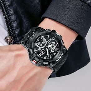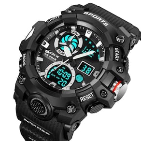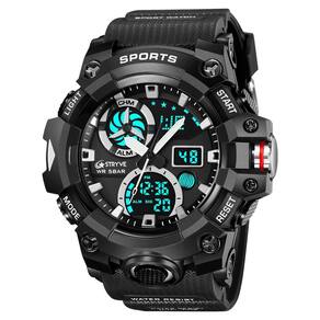 Características: Marca: Stryve Modelo: S8027 Categoria: AnaDigi Analógico: Sim Movimento: Quartzo Ponteiros Fluorescentes: Sim Digital: Sim 2 Horários Formato da hora: 12/24 Despertador: Sim Bip de Hora: Sim Calendário: Sim Mostra o Dia da Semana: Sim Mostra o Dia do Mês: Sim Cronômetro: Sim Cronômetro Regressivo timer : Não Luz: Sim Cor da Iluminação: Verde Resistente à Água: 5BAR/5ATM/50M não pressionar os botões quando estiver submerso - Respingos: Sim - Chuva: Sim - Lavar Louça: Sim - Natação: Sim - Mergulho: Não Característica do Vidro: Acrílico Tipo de Fecho: Fivela Simples Material da Caixa: Liga de Zinco e Plástico Material da Pulseira: Borracha Formato da Caixa: Redondo Diâmetro da Caixa: 55 mm Espessura da Caixa: 19 mm Largura da Pulseira: 22 mm Comprimento da pulseira: 265 mm Ajustável Alimentação: Bateria Peso Líquido: 72g : 03 Meses Conteúdo da Embalagem: - Relógio - Manual de Instruções