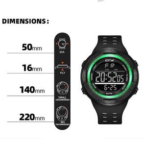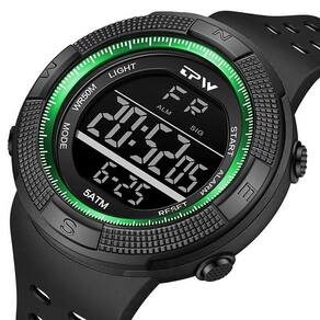 Características: Marca: TPW Modelo: K9020 Categoria: Digital 2 Horários Formato da hora: 12/24h Despertador: Sim Bip de hora em hora: Sim Calendário: Sim Mostra o Dia da Semana: Sim Mostra o Dia do Mês: Sim Cronômetro: Sim Luz: Sim Cor da Iluminação: Verde Resistente à Água: 5BAR/5ATM/50M Pode ser para nadar no raso, por pouco tempo submerso - Respingos: Sim - Chuva: Sim - Lavar Louça: Sim - Natação: Sim - Mergulho: Não Característica do Vidro: Acrílico Tipo de Fecho: Fivela Dupla Material da Caixa: Plástico Material da Pulseira: Borracha Formato da Caixa: Redondo Diâmetro da Caixa: 50 mm Espessura da Caixa: 16 mm Largura da Pulseira: 23 mm Comprimento Máximo da pulseira: 220 mm Alimentação: Bateria Peso Líquido: 60g : 03 Meses Conteúdo da Embalagem: - Relógio - Estojo do relógio - Manual em Inglês