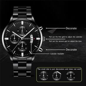 Relógio não é à prova d água. Ponteiros menores do interior do relógio decorativos, fixos. Calendário funcional.