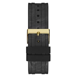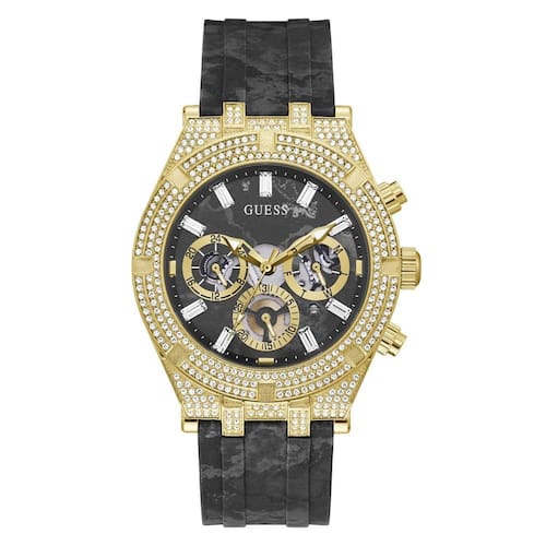 Relógio multifuncional masculino GUESS Sport Crystal de 44 mm — Mostrador preto Caixa de aço inoxidável dourado com pulseira de silicone preta — Pulseira de silicone preta de 22 mm que se encaixa na circunferência do pulso de até 7,75 polegadas — Mostrador preto com acabamento solar; detalhes dourados e ponteiros contrastantes; marcadores completos — Caixa de aço inoxidável prateado de 44 mm; cristal de vidro mineral; anel superior incrustado de cristal — Submostradores multifuncionais exibem dia, data e 24 horas - Resistente à água até 50 m (165 pés): em geral, adequado para curtos períodos de natação recreativa, mas não para mergulho ou snorkel