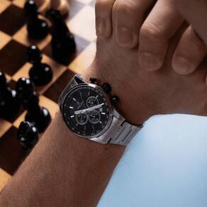 O Hazard é o relógio esportivo perfeito para um visual marcante. Sua versatilidade destaca-se ao combinar harmoniosamente com trajes casuais ou sociais. Equipado com uma máquina Japonsa, oferece funcionalidades como calendário, cronógrafo e taquímetro. A fusão de tons prata e preto confere ao relógio Hazard uma versatilidade extraordinária.