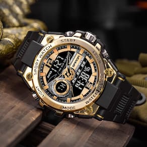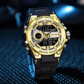 - ?Multifunções: 1. Mostrador duplo analógico e digital suporta dois fusos horários diferentes 2. Alarme 3. Luz traseira de LED (mostra a hora clara no escuro) 4. Data 5. Cronômetro 6. Opção de formato 12/24H 7. Resistente a impactos. Essas funções o tornam perfeito para todos os tipos de esportes e uso diário