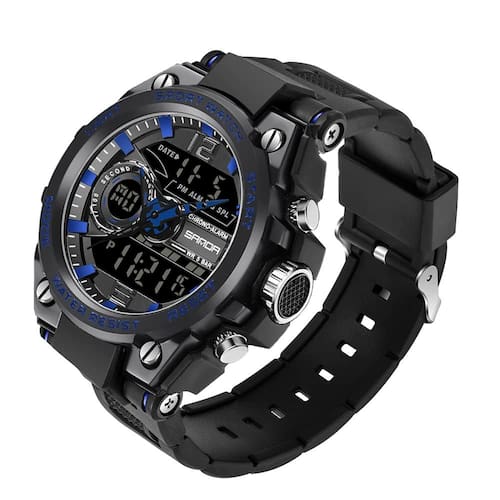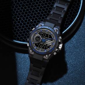 - ?Multifunções: 1. Mostrador duplo analógico e digital suporta dois fusos horários diferentes 2. Alarme 3. Luz traseira de LED (mostra a hora clara no escuro) 4. Data 5. Cronômetro 6. Opção de formato 12/24H 7. Resistente a impactos. Essas funções o tornam perfeito para todos os tipos de esportes e uso diário