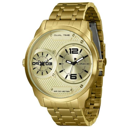 Marca: Lince Gênero: Masculino Vidro: Cristal Mineral Funções: Analógico, Dual Time Resistência à Água: 50 m Características: com caixa metal e pulseira de Aço Inoxidável Diâmetro da Caixa: 50 mm Fundo de Pressão Alimentação do Maquinário: Bateria Mostrador Champanhe com 2 Máquinas