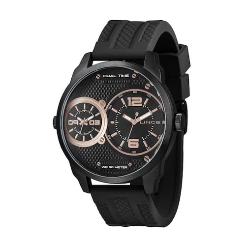 Marca: Lince Gênero: Masculino Visor: Preto Vidro: Cristal mineral Resiste à água: 5ATM Diâmetro da Caixa: 50mm Pulseira: Silicone Características: dual time Marca: Não Informado