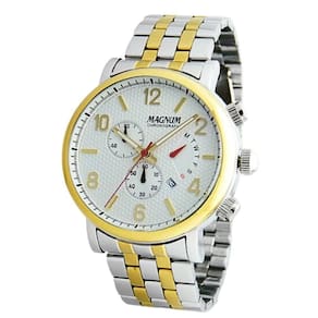 Relógio Masculino Magnum Cronógrafo MA35226S - Prata Relógio Masculino Magnum Cronógrafo Possui incrível design, deixando seu look mais despojado e elegante ao mesmo tempo. Além disso, foram confeccionados com material de primeiríssima qualidade, tornando-o resistente e durável. Características:ean: 7891511426624Marca: Magnum Modelo: MA35226SCor da caixa: PrataMaterial da caixa: AçoCor da Pulseira: Prata e douradoMaterial da pulseira: AçoVidro: Cristal MineralCor do bisel: DouradoFunções: Analógico, Cronógrafo, CalendárioResistência à água: 10 ATMDimensões da Embalagem:Altura: 10cmLargura: 14cmProfundidade: 16cmPeso: 0,500KgGarantia: 12 Meses Marca: Não Informado