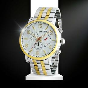 Relógio Masculino Magnum Cronógrafo MA35226S - Prata Relógio Masculino Magnum Cronógrafo Possui incrível design, deixando seu look mais despojado e elegante ao mesmo tempo. Além disso, foram confeccionados com material de primeiríssima qualidade, tornando-o resistente e durável. Características:ean: 7891511426624Marca: Magnum Modelo: MA35226SCor da caixa: PrataMaterial da caixa: AçoCor da Pulseira: Prata e douradoMaterial da pulseira: AçoVidro: Cristal MineralCor do bisel: DouradoFunções: Analógico, Cronógrafo, CalendárioResistência à água: 10 ATMDimensões da Embalagem:Altura: 10cmLargura: 14cmProfundidade: 16cmPeso: 0,500KgGarantia: 12 Meses Marca: Não Informado
