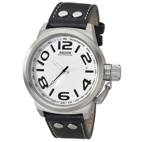 Descrição do Relógio Marca : Magnum Modelo : MA31551Q Linha: Military Genero : Masculino Mostrador : Branco Cronógrafo Bísel: Preto Caixa : Prata Pulseira: Preto Mecanismo : Quartz / Analógico Calendário : Dia Coroa : Simples com capa protetora Fundo : Rosqueado Resistencia a água : 10 ATM Vidro : Cristal Mineral Material da Caixa : Aço Inoxidável Material da Pulseira : Couro Diâmetro da Caixa : 48 mm Diâmetro do Visor : 40mm Espessura da Caixa : 15 mm Largura da Pulseira : 24 mm Trava : Fivela Comprimento da Pulseira : 20 cm Peso : 110 gramas Fabricante : Magnum Industria da Amazonia S/A Garantia : garantia de 2 anos direto com fabricante