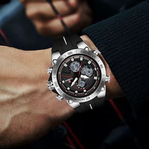 Este relógio masculino moderno utiliza movimento de quartzo de precisão e apresenta um display analógico-digital, garantindo fácil leitura em qualquer ambiente. Sua resistência à água de 5bar oferece tranquilidade para atividades aquáticas moderadas, enquanto a luminosidade dos ponteiros garante visibilidade noturna. Com uma pulseira de silicone confortável e durável, sua experiência de uso será sempre agradável, independentemente da situação. Verdadeiramente redefine o que significa ter um relógio multifuncional que não compromete o estilo.