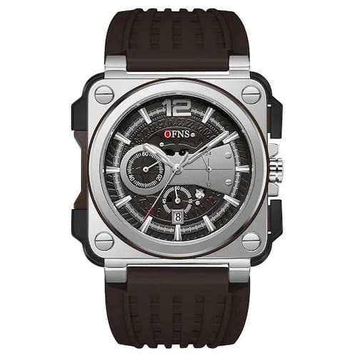 Esse Rélógio para os manos que curtem um estilo de vida ativo e vibes chiques. Este relógio pica é um cronógrafo à prova d'água com um design quadrado que não passa despercebido. Imagina só, um relógio que não só te mostra as horas, mas também resiste a altas aventuras, desde um rolê numa festa na piscina até um evento elegante!