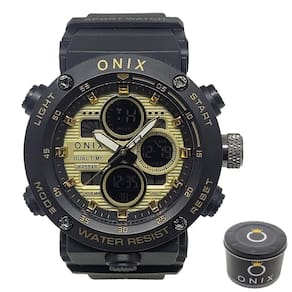 Relógio Masculino Onix AnaDigi OX116 Preto e Dourado Relógio Masculino Onix AnaDigi OX116 Preto e Dourado Marca: Onix Categoria: AnaDigi ógico: Sim 1 Horário Ponteiros Fluorescentes: Sim Digital: Sim 1 Horário Calendário: Sim Despertador: Sim Mostra o Dia da Semana: Sim Mostra o Dia do Mês: Sim Cronômetro: Sim Contador Regressivo: Não Luz: Sim Cor da Iluminação: Verde Resistente à Água: 5 ATM Pode ser para nadar no raso, por pouco tempo submerso - Respingos: Sim - Chuva: Sim - Lavar Carro: Sim - Lavar Louça: Sim - Natação: Sim - Mergulho: Não Característica do Vidro: Acrílico Tipo de Fecho: Fivela Cor da Caixa: Preto Material da Caixa: Plástico Formato da Caixa: Redondo Diâmetro da Caixa: 49,00 mm Espessura da Caixa: 17,00 mm Cor da Pulseira: Preto Material da Pulseira: Borracha Largura da Pulseira: 21,50 mm Comprimento Máximo da Pulseira: 240,00 mm Alimentação: Bateria Interna Peso Líquido: 0,070 Kg Modelo: OX116 Cor Predominante: Preto Cor Diferencial: Dourado : 12 Meses Conteúdo da Embalagem: 01 Relógio 01 Embalagem 01 Termo de Marca: Não Informado