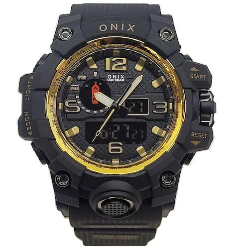 Relógio Masculino Onix AnaDigi OX117 Preto e DouradoMarca: Onix Categoria: AnaDigi Analógico: Sim (1 Horário) Ponteiros Fluorescentes: Sim Digital: Sim (1 Horário) Calendário: Sim Despertador: Sim Mostra o Dia da Semana: Sim Mostra o Dia do Mês: Sim Cronômetro: Sim Contador Regressivo: Não Luz: Sim Cor da Iluminação: VerdeResistente à Água: 5 ATM (Pode ser utilizado para nadar no raso, por pouco tempo submerso) - Respingos: Sim - Chuva: Sim - Lavar Carro: Sim - Lavar Louça: Sim - Natação: Sim - Mergulho: Não Característica do Vidro: Acrílico Tipo de Fecho: Fivela Cor da Caixa: Preto Material da Caixa: Plástico Formato da Caixa: Redondo Diâmetro da Caixa: 55,00 (mm) Espessura da Caixa: 18,50 (mm) Cor da Pulseira: Preto Material da Pulseira: Borracha Largura da Pulseira: 22,00 (mm) Comprimento Máximo da Pulseira: 250,00 (mm) Alimentação: Bateria Interna Peso Líquido: 0,060 Kg Modelo: OX117 Cor Predominante: Preto Cor Diferencial: Dourado Garantia: 12 MesesConteúdo da Embalagem: 01 Relógio 01 Embalagem 01 Termo de Garantia Ean: 7891368316963