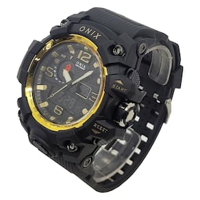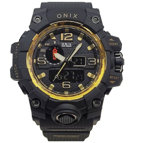 Relógio Masculino Onix AnaDigi OX117 Preto e Dourado Relógio Masculino Onix AnaDigi OX117 Preto e Dourado Marca: Onix Categoria: AnaDigi ógico: Sim 1 Horário Ponteiros Fluorescentes: Sim Digital: Sim 1 Horário Calendário: Sim Despertador: Sim Mostra o Dia da Semana: Sim Mostra o Dia do Mês: Sim Cronômetro: Sim Contador Regressivo: Não Luz: Sim Cor da Iluminação: Verde Resistente à Água: 5 ATM Pode ser para nadar no raso, por pouco tempo submerso - Respingos: Sim - Chuva: Sim - Lavar Carro: Sim - Lavar Louça: Sim - Natação: Sim - Mergulho: Não Característica do Vidro: Acrílico Tipo de Fecho: Fivela Cor da Caixa: Preto Material da Caixa: Plástico Formato da Caixa: Redondo Diâmetro da Caixa: 55,00 mm Espessura da Caixa: 18,50 mm Cor da Pulseira: Preto Material da Pulseira: Borracha Largura da Pulseira: 22,00 mm Comprimento Máximo da Pulseira: 250,00 mm Alimentação: Bateria Interna Peso Líquido: 0,060 Kg Modelo: OX117 Cor Predominante: Preto Cor Diferencial: Dourado : 12 Meses Conteúdo da Embalagem: 01 Relógio 01 Embalagem 01 Termo de Marca: Não Informado Ean: 7891368316963
