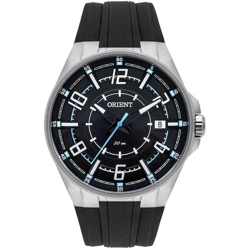 Vidro: cristal mineral Funções: calendario duplo, analógico Resistencia à água: 50 m Características: com caixa aço inoxidável e pulseira silicone preta Diâmetro da caixa: 4,5 cm Alimentação do maquinário: bateria Mostrador preto com números e detalhes em azul