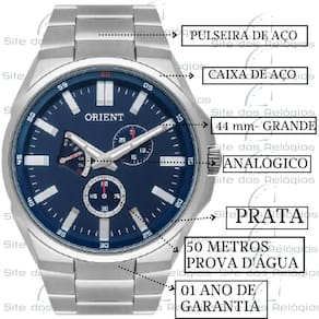 Relógio Masculino Orient Mbssm087 D1SxO Relógio é um dos acessórios mais presentes em todas as fases da nossa vida, mesmo com inúmeros dispositivos modernos que mostram as horas, o clássico relógio para pulso não perdeu seu charme e é uma ótima opção para complementar o visual. O Relógio Masculino Orient Mbssm087 D1Sx é perfeito para uso pessoal ou para presentear alguém especial em uma data comemorativa, sendo um presente único, de ótimo gosto, elegância e muita praticidade.Produzido com materiais resistentes e de qualidade, a peça reúne sofisticação e estilo em um único item. A escolha perfeita para homens elegantes, que gostam de ter um acessório que complemente o look em qualquer ocasião. Especificações Gênero: Masculino Cor da pulseira: PrataCor da Caixa: AzulNível de resistência à água: 5 atmEste produto acompanha emb.Orig, manual em português e nota fiscal eletrônica.