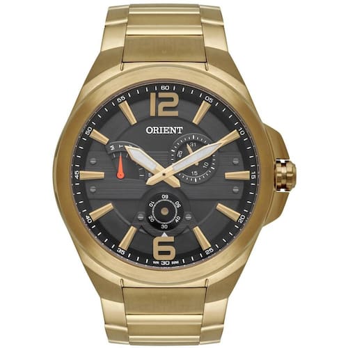 Relógio orient masculino ref: mgssm036 p2kx multifunção dourado Descrição do produto: Vidro: cristal mineral Funções: analógico, multifunção calendário mensal, semanal , segundeiro deslocado Resistencia à água: 50 m Características: com caixa aço inoxidável e pulseira de aço inoxidável Diâmetro da caixa: 4,6 cm Alimentação do maquinário: bateria Estilo: casual Mostrador preto com número Fundo rosqueado de 1 ano Ean: 7891529986530