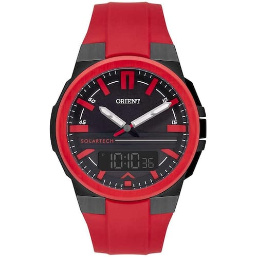 Relógio orient masculino ref: mtspa004 p1vx anadigi solar black Descrição do produto: Vidro: cristal mineral Funções: anadigi, cronógrafo, calendário, iluminação, alarme, solar, dual time, indicador de nível de carga Resistencia à água: 100 m Caixa parafusada Características: com caixa aço inoxidável e pulseira de silicone vermelha Diâmetro da caixa: 4,4 cm Alimentação do maquinário: energia solar Estilo: esportivo Linha: solartech Mostrador preto com detalhe em vermelho de 1 ano Ean: 7891529981177