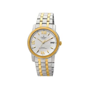 Características Composição do Vidro: Cristal Mineral Material da Caixa: Aço Inoxidável Cor da Caixa: Prata Material da Pulseira: Aço Inoxidável Cor da Pulseira: Mista Prata e Dourado Mostrador: Analógico, fundo Prateado com Indicadores dourado Função: Calendário
