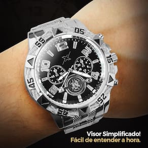 O relógio apresenta um formato redondo, todo prateado e feito em aço inoxidável. Com mostrador preto, criando um contraste elegante e moderno, e detalhes internos únicos que tornam cada peça especial. Além disso, o relógio é personalizável, permitindo que você insira seu nome ou o nome de quem deseja presentear, tornando-o ainda mais especial.