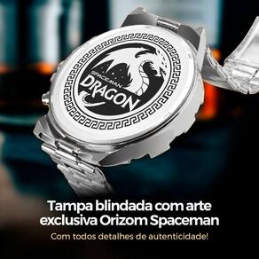 Relógio Masculino Orizom Spaceman Dragon Com visual robusto e imponente, este relógio é fabricado em aço inoxidável na cor prata, com acabamento refinado e tampa traseira blindada com arte exclusiva de dragão gravada a laser. Resistente à água para situações cotidianas, conta com todos os elementos de autenticidade de um produto Orizom, garantindo originalidade e durabilidade.