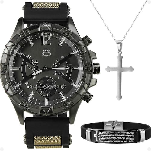 Este kit de acessórios masculinos da marca Orizom é o que você precisa para adicionar estilo, qualidade e espiritualidade ao seu visual. Composto por um relógio premium, cordão, pingente em forma de cruz e uma pulseira com oração, este conjunto exclusivo oferece tudo que você precisa para se destacar.