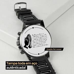 Relógio Masculino Orizom Spaceman: Garanta durabilidade e um visual moderno com este relógio analógico premium, todo preto com detalhes internos exclusivos da oração do Pai Nosso. A pulseira de silicone ajustável garante conforto e estilo.