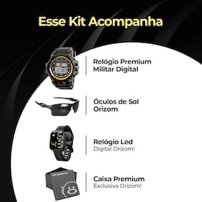Surpreenda-se com nosso Kit Exclusivo:Relógio Masculino Orizom Spaceman - Preto e Dourado:- Digital e à prova d'água.- Pulseira em silicone reforçado e ajustável para qualquer pulso.- Recursos completos: alarme, luz de LED e cronômetro.- Elegância e funcionalidade em um só acessório.Relógio Digital Masculino - Preto e à Prova d'Água:- Design moderno e resistência à água.- Pulseira ajustável para o máximo conforto.Óculos de Sol Esportivo - Proteção UV, Qualidade Premium:- Estilo esportivo para um visual dinâmico.- Proteção UV para cuidar dos olhos com qualidade premium.Caixa Premium Orizom Spaceman:- Desenhada especialmente para acomodar os relógios com elegância.- Um toque de sofisticação para armazenar e exibir suas peças.Ideal para presentear:- Um conjunto completo para quem valoriza estilo, funcionalidade e qualidade.- Surpreenda alguém especial com este kit único e versátil.Eleve o presente a um novo patamar com este Kit Exclusivo, perfeito para ocasiões especiais. Garanta já o seu!