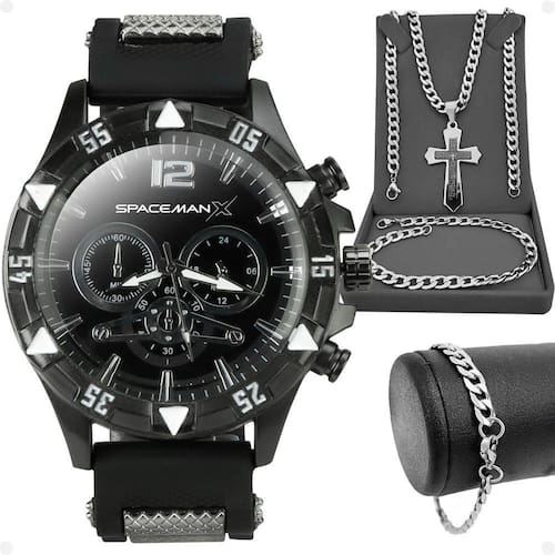 Kit Especial Orizom Spaceman X para Presentear Quem Você Ama!Surpreenda aquela pessoa especial em sua vida com este kit exclusivo, composto por:- 1 Relógio Analógico Masculino Orizom Spaceman X: Maquinário em aço inoxidável com pintura eletrostática preta, mostrador elegante e pulseira ajustável em silicone.- 1 Cordão em Aço Inoxidável Grumet: Robusto e elegante, feito de aço inoxidável de alta qualidade.- 1 Pingente em Aço Inoxidável em Formato de Crucifixo: Com a oração do Pai Nosso gravada a laser, uma peça simbólica de fé e proteção.- 1 Pulseira em Aço Inoxidável: Acessório clássico e versátil para adicionar estilo ao pulso masculino.Este Kit Especial Orizom Spaceman X é o presente ideal para demonstrar todo o seu carinho e amor. Surpreenda e encante com este conjunto único e significativo! Aproveite e garanta o seu agora mesmo!