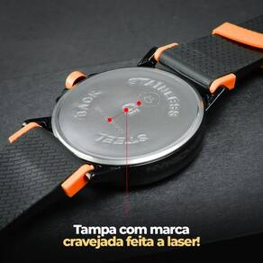 Predominantemente preto com detalhes em laranja, e pulseira de borracha ajustável, este relógio se destaca por sua personalidade vibrante e design marcante. A combinação de cores não apenas proporciona um visual dinâmico, mas também destaca o relógio como uma peça versátil, adequada tanto para ocasiões casuais quanto formais.