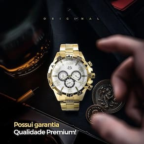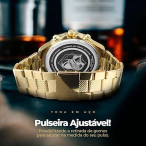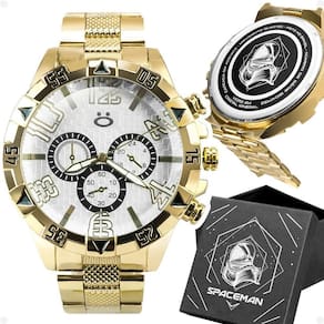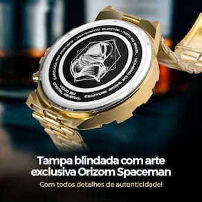 - Tipo: Analógico (ponteiro) - Modelo: Spaceman - Qualidade: Premium - Cor: Dourado banhado - Mostrador: Dourado (opção na cor branca também disponível) - Material: Todo em aço inoxidável - Resistência à água: Prova d'água - Tampa: Blindada com arte exclusiva Orizom Spaceman e detalhes de autenticidade