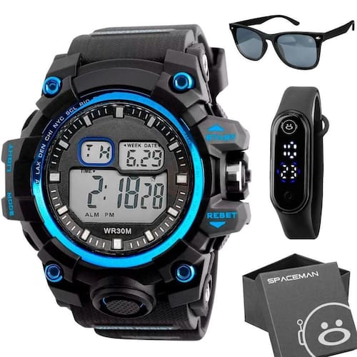 - 1 Relógio digital Masculino Orizom Spaceman Preto com Detalhes em Azul: À Prova D'água, Pulseira em Silicone Ajustável e Reforçada, para um estilo elegante e resistente.