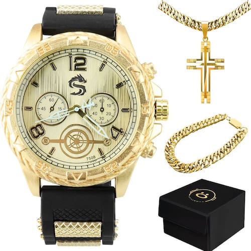 "Chegou o Relógio Orizom Spaceman "Dragon" Dourado, a expressão máxima de elegância e sofisticação, com um toque contemporâneo! Sua caixa dourada premium da marca Orizom Spaceman confere uma aparência luxuosa, enquanto a pulseira de silicone ajustável proporciona conforto e praticidade. Além disso, este incrível relógio vem acompanhado de acessórios adicionais, como o cordão Grumet banhado a Ouro 18k (11mm) e pingente grande em forma de cruz, garantindo elegância em cada detalhe. Com design moderno e elementos adicionais, este relógio é a escolha perfeita para quem busca funcionalidade aliada à elegância. Garanta já o seu e eleve o seu estilo para outro nível com o Relógio Orizom Spaceman "Dragon" Dourado!"